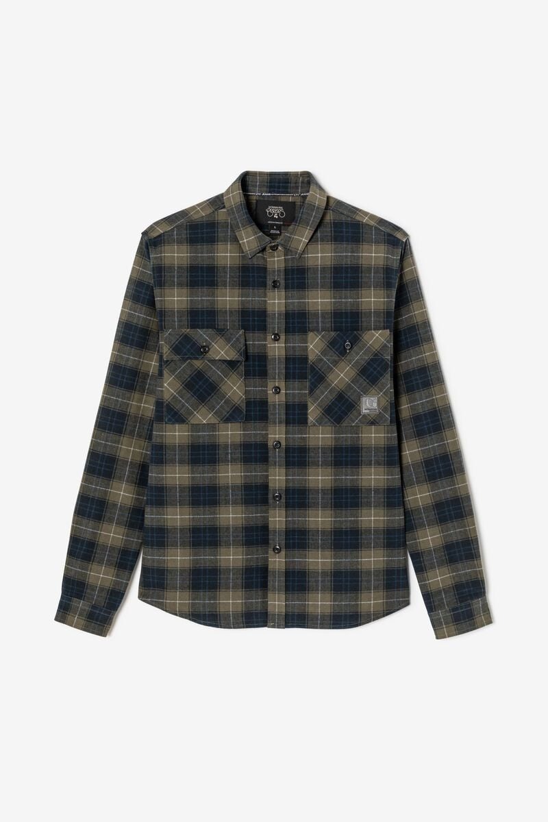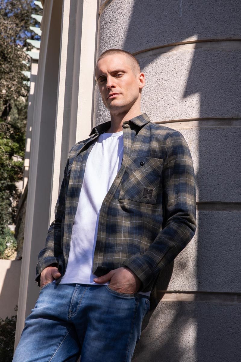 Camisa de algodón grueso a cuadros verdes, bolsillos en el pecho.