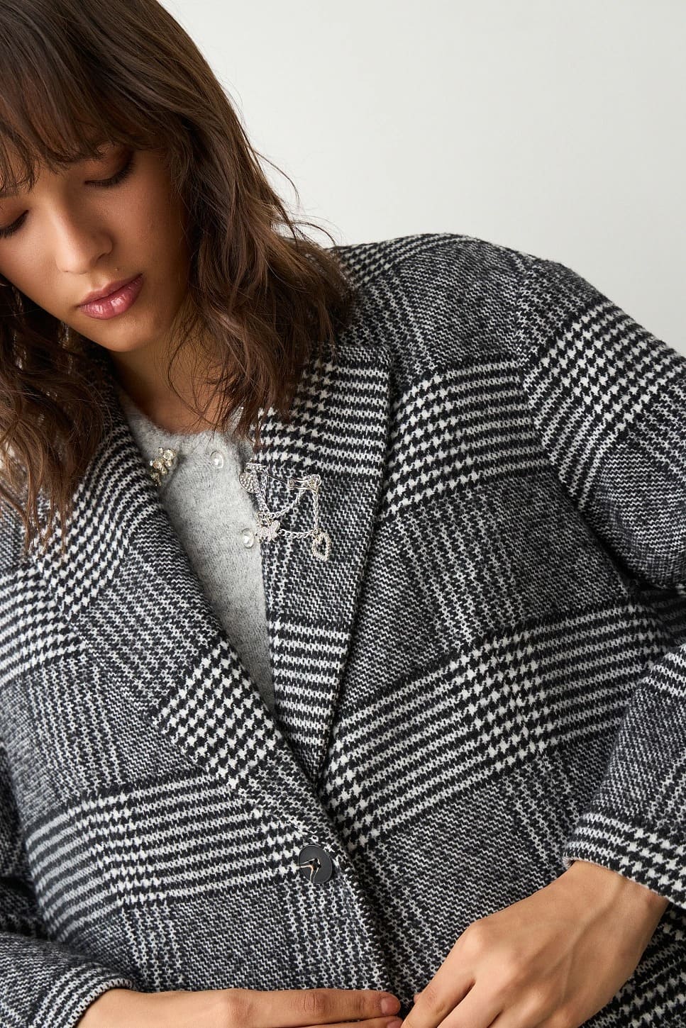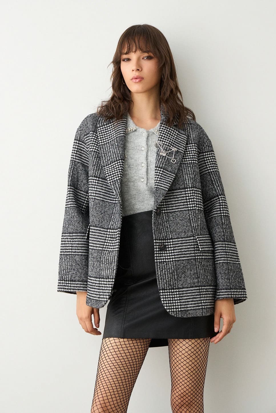Blazer de cuadros, con pin, con cuello solapa, cierre de botones, con bolsillos, textura lana