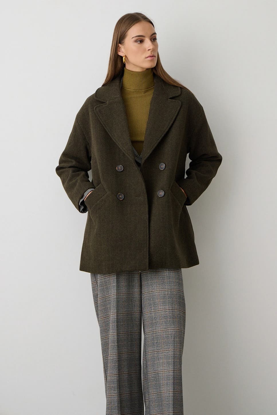 Abrigo corto, con mangas largas, cierre con botones, cuello con solapa, bolsillos, tejido grueso, diseño recto