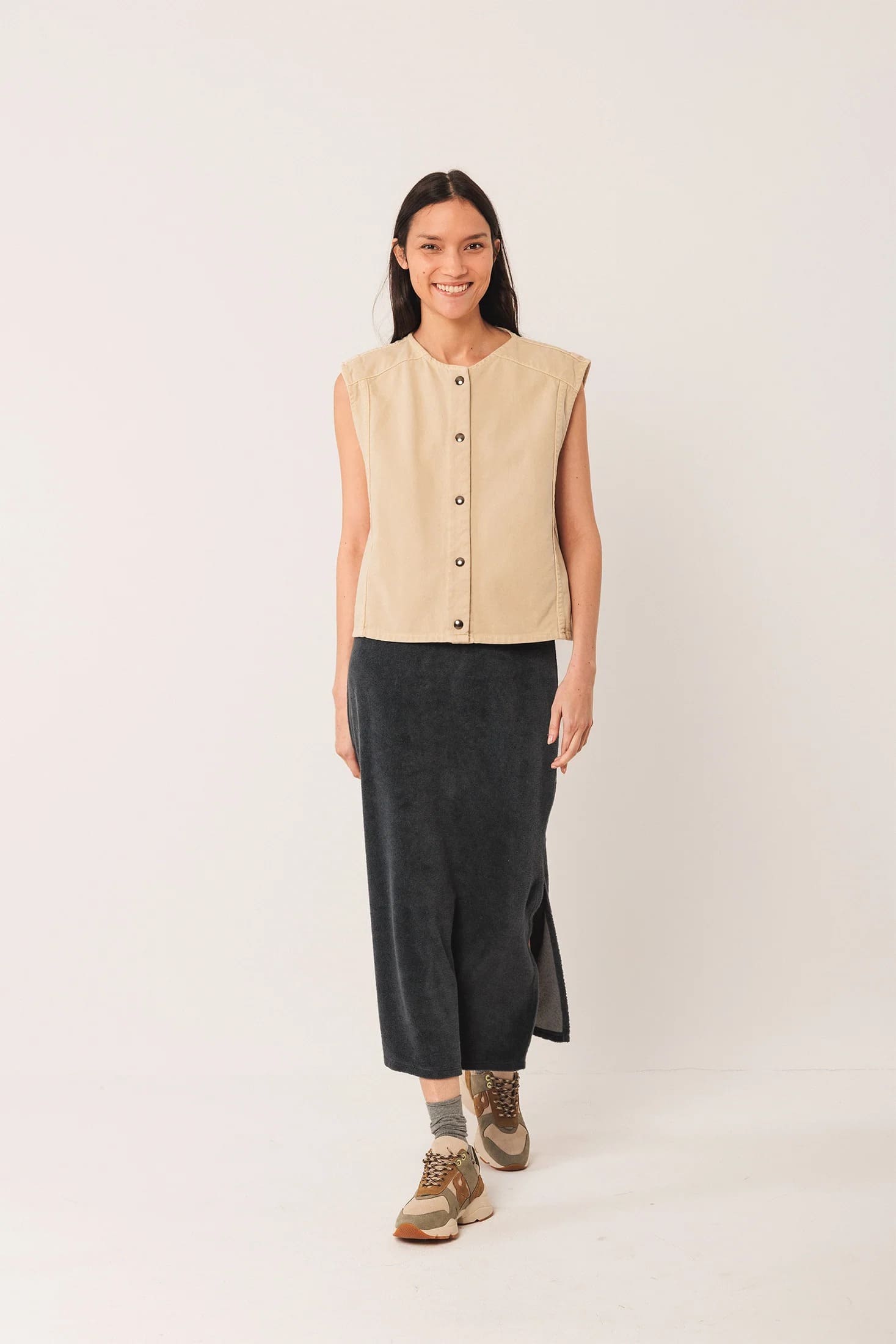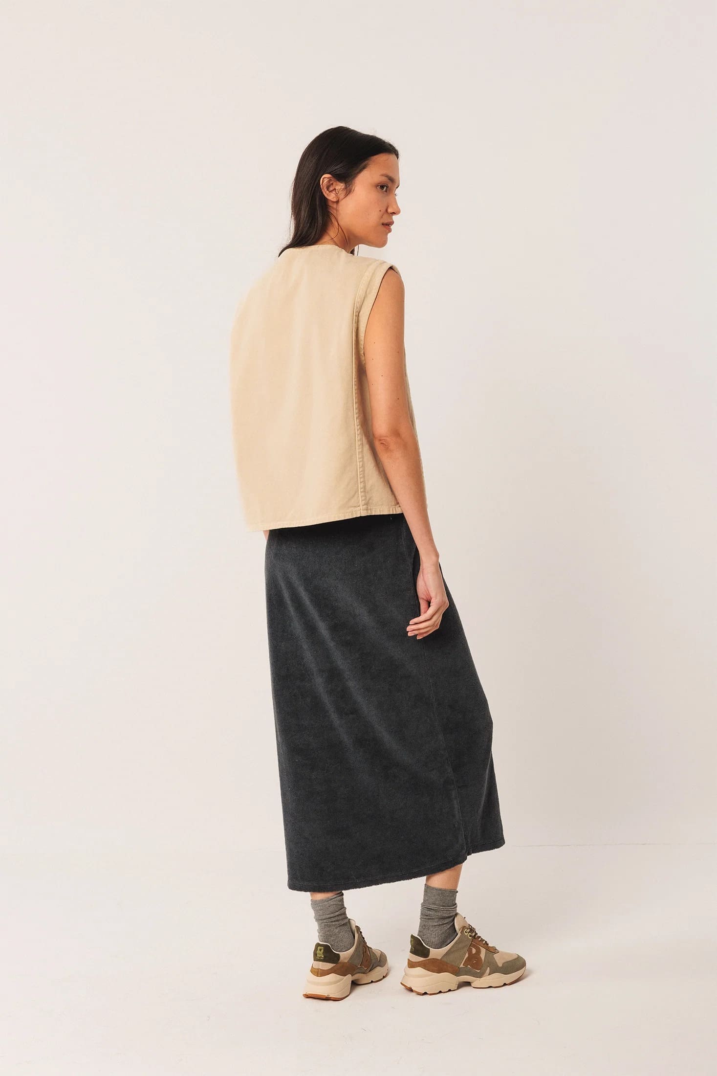 Tiene la cintura engomada, el corte recto ligeramente ajustado y una abertura lateral.