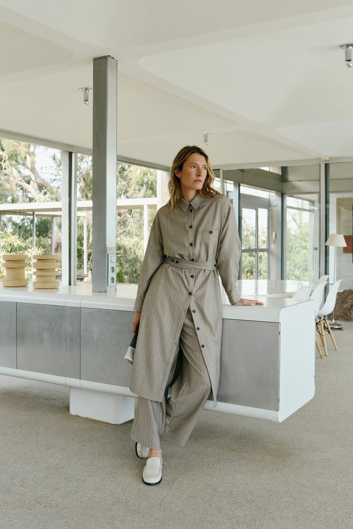 • Cintura media con pinzas y cierre de cremallera y botón oculto