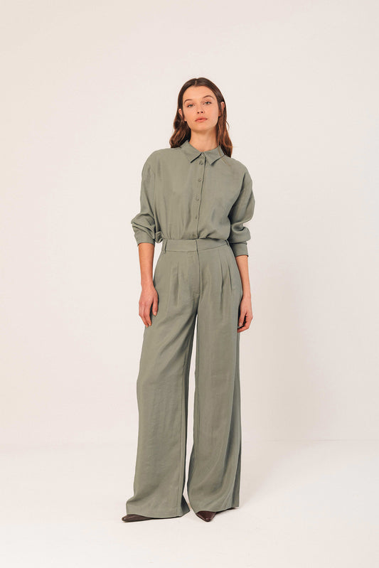 Pantalón con pernera ancha y mucha caída por su composición de modal.