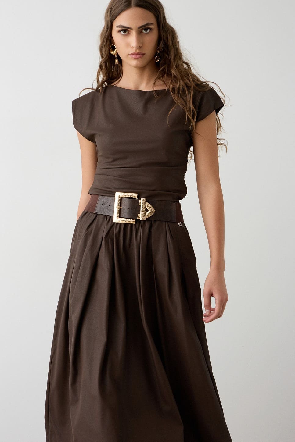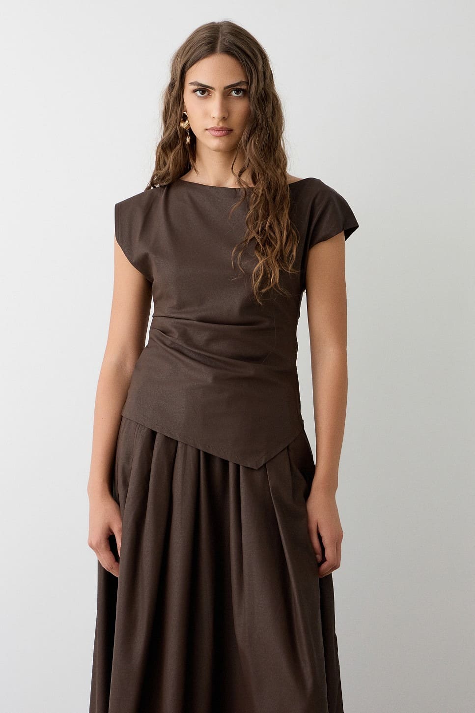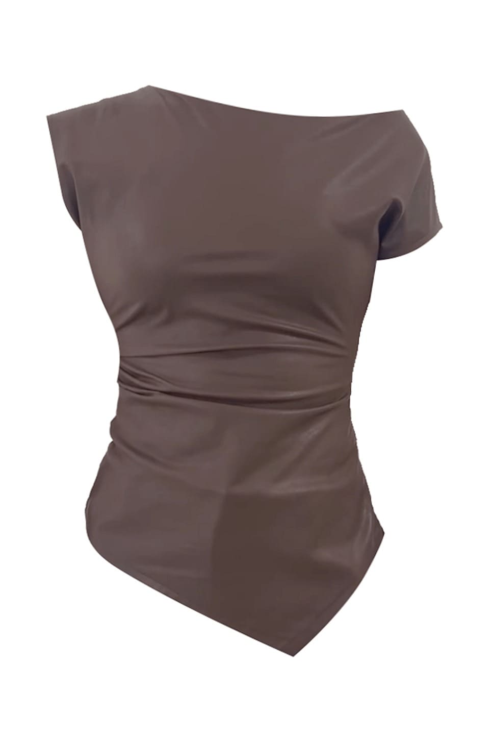 Top efecto piel, fruncido, mangas cortas, escote recto, asimétrico, diseño recto